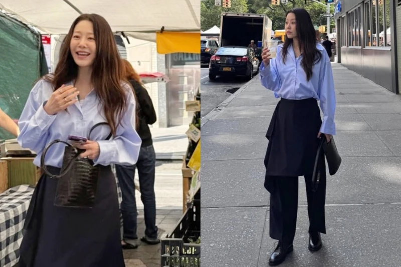 时装秀后,高贤廷换上宽鬆的衬衫造型,浅蓝色的衬衫搭配西装裤,下身巧妙的叠加上片裙让基本款的长裤衬衫组合多了时髦的层次感!