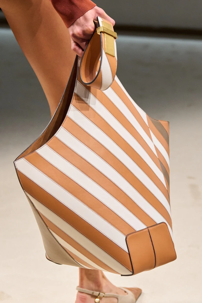 单就包型的话,大容量的水桶包似乎是2026春夏秀上最受欢迎的包款,包含Hermès帆布与皮革拼接款式,以及Loewe与Tod’s所推出的撞色皮革样式,或将成为下一季的流行通勤包款。